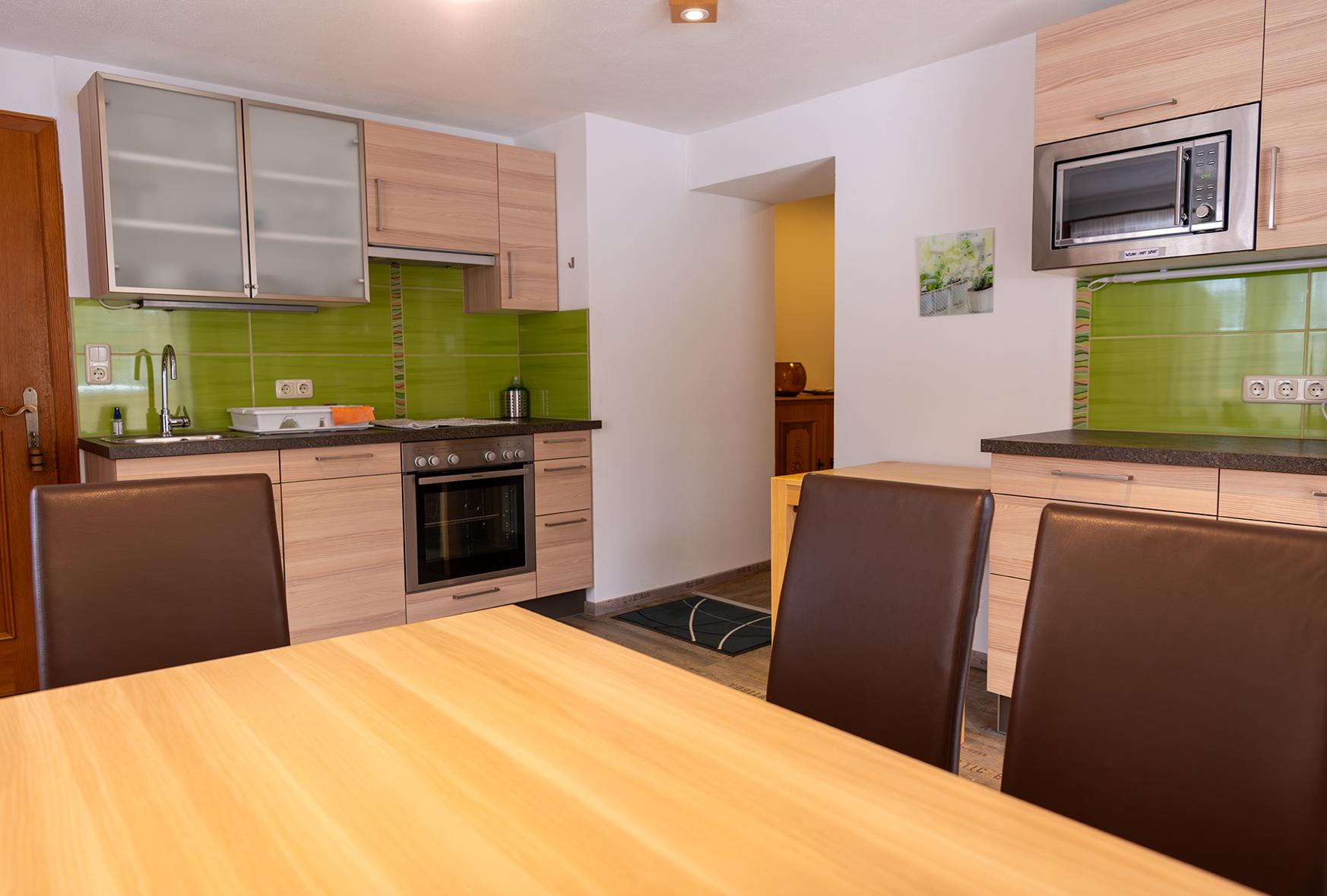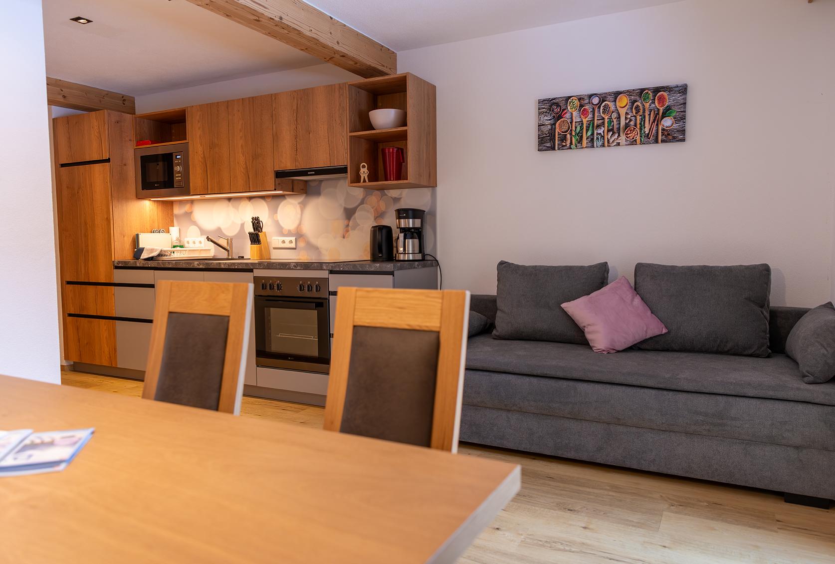 In der Wohnküche befindet sich neben der Essecke und der Küchenzeile auch eine Schlafcouch für 2 Personen.
